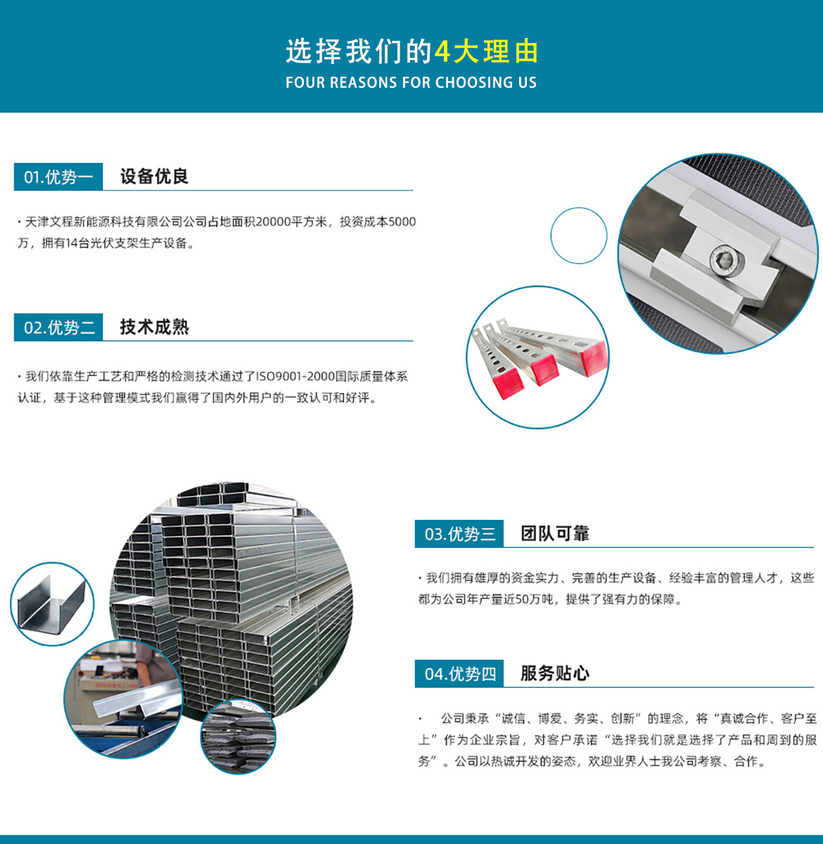 天津文程新能源科技有限公司成立于2021年,是專注于集中式、分布式、漁光互補和農光互補等清潔能源發電的綜合性企業 公司是集設計、研發、生產、制造為一體的綜合型企業。公司占地面積20000平方米,注冊資金5000萬元整。公司坐落于華北鋼鐵重鎮--大邱莊,距天津市區50公里、鄰104和205國道及京滬高速,交通十分便捷。 本公司擁有三個生產車間,其中兩個冷彎型鋼車間,一個鋅鋁鎂型鋼車間,擁有自動冷彎成型機10條,自動數控沖孔機10條以及焊接加工等設備。主要生產產品有:太陽能光伏支架、各種規格的C/Z/U型鋼、抗震支架、管廊支架及整套配件等。